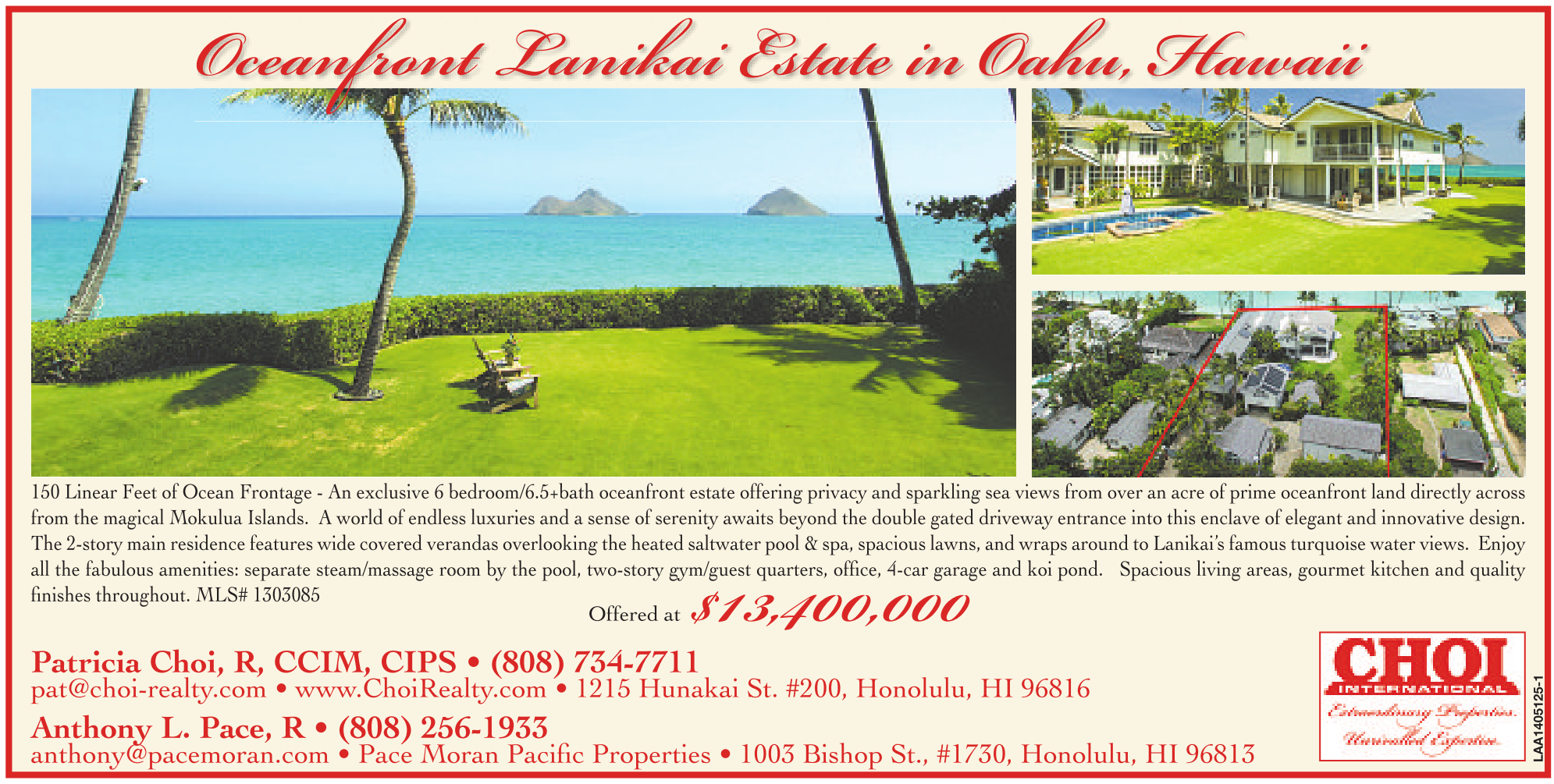 Oceanfront Lanikai Estate in Oahu, Hawaii 150 Linear Feet of Ocean Frontage - An exclusive 6 bedroom/6.5+bath oceanfront estate offering privacy and sparkling sea views from over an acre of prime oceanfront land directly across from the magical Mokulua Islands. A world of endless luxuries and a sense of serenity awaits beyond the double gated driveway entrance into this enclave of elegant and innovative design. The 2-story main residence features wide covered verandas overlooking the heated saltwater pool &spa, spacious lawns, and wraps around to Lanikai’sfamous turquoise water views. Enjoy all the fabulous amenities: separate steam/massage room by the pool, two-story gym/guest quarters, office, 4-car garage and koi pond. Spacious living areas, gourmet kitchen and quality finishes throughout. MLS# 1303085 Offered at $13,400,000 Patricia Choi, R, CCIM, CIPS • (808) 734-7711 pat@choi-realty.com • www.ChoiRealty.com • 1215 Hunakai St. #200, Honolulu, HI 96816 Anthony L. Pace, R • (808) 256-1933 anthony@pacemoran.com • Pace Moran Pacific Properties • 1003 Bishop St., #1730, Honolulu, HI 96813