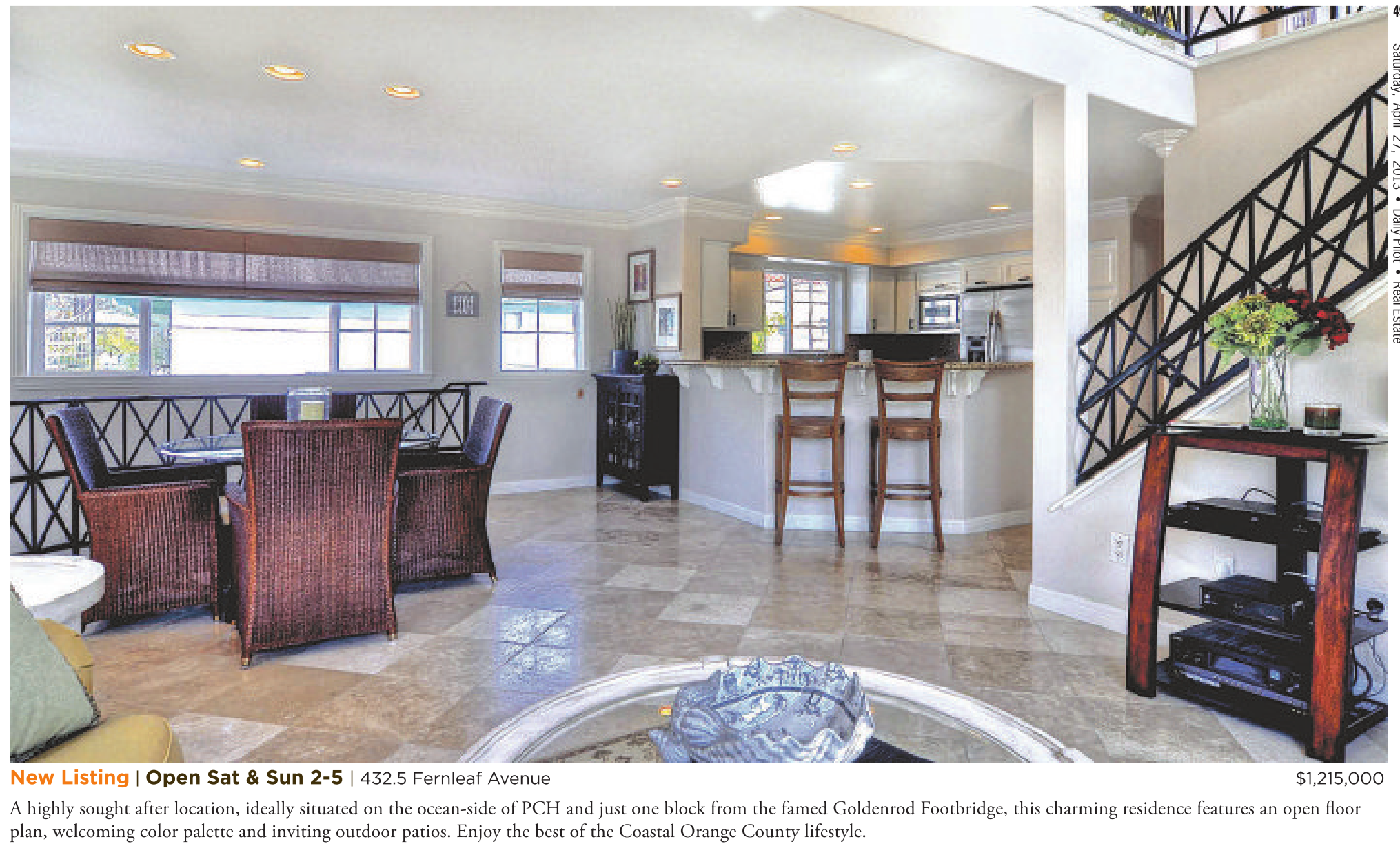 49 New Listing | Open Sat & Sun 2-5 | 432.5 Fernleaf Avenue $1,215,000 A highly sought after location, ideally situated on the ocean-side of PCH and just one block from the famed Goldenrod Footbridge, this charming residence features an open floor plan, welcoming color palette and inviting outdoor patios. Enjoy the best of the Coastal Orange County lifestyle.