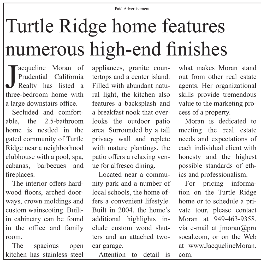 For pricing information on the Turtle Ridge home or to schedule a private tour, please contact Moran at 949-463-9358, via e-mail at jmoran@pru socal.com, or on the Web at www.JacquelineMoran. com.