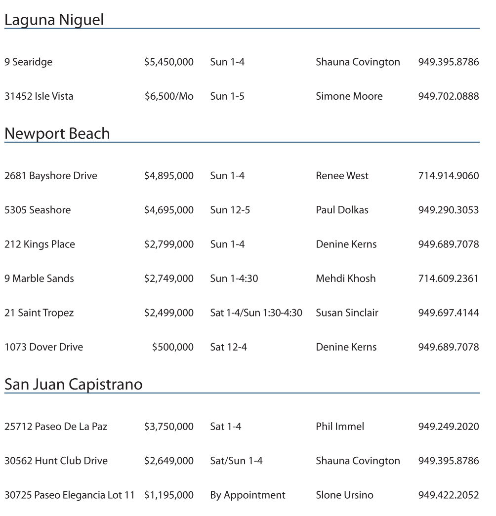 21 Saint Tropez $2,499,000 Sat1-4/Sun 1:30-4:30 Susan Sinclair 949.697.4144
