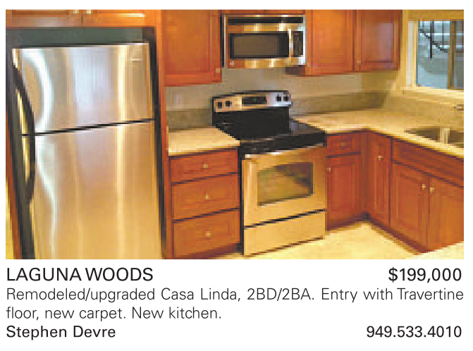 LAGUNA WOODS $199,000 Remodeled/upgraded Casa Linda, 2BD/2BA. Entry with Travertine floor, new carpet. New kitchen. Stephen Devre 949.533.4010