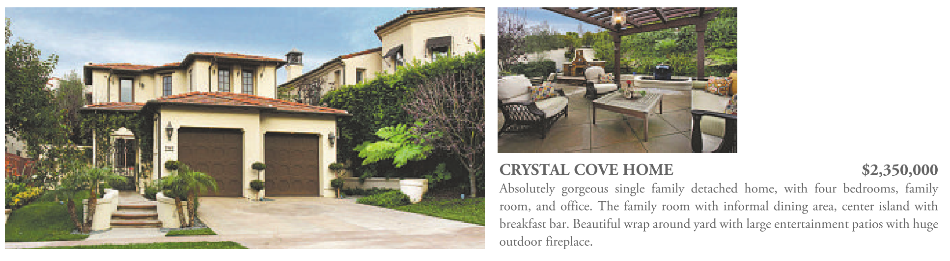 CRYSTAL COVE HOME $2,350,000 Absolutely gorgeous single family detached home, with four bedrooms, family room, and office. The family room with informal dining area, center island with breakfast bar. Beautiful wrap around yard with large entertainment patios with huge outdoor fireplace.