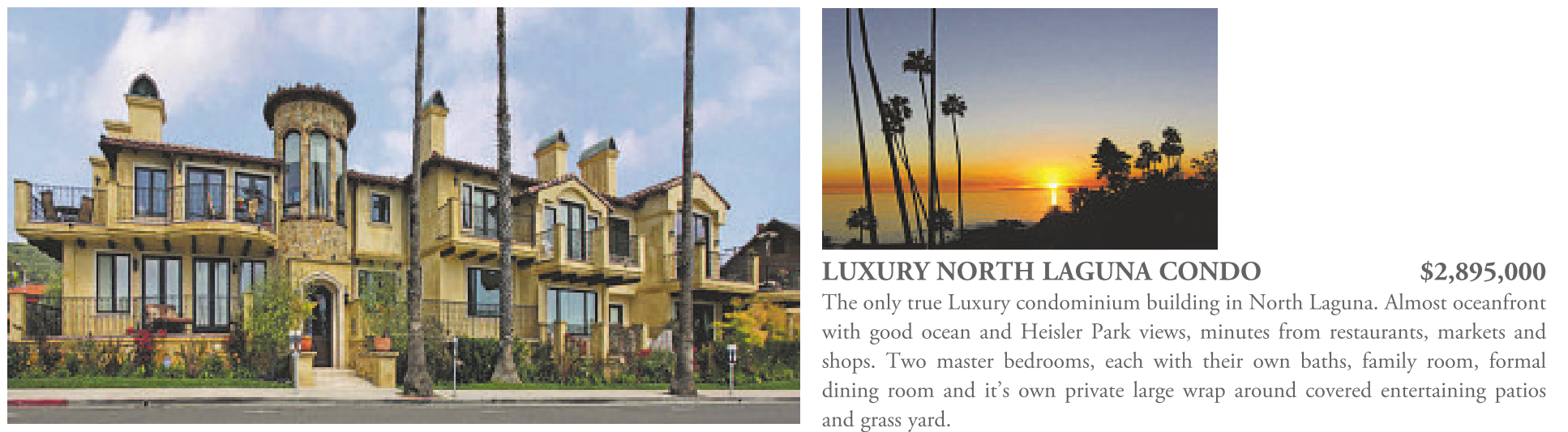 LUXURY NORTH LAGUNA CONDO $2,895,000 The only true Luxury condominium building in North Laguna. Almost oceanfront with good ocean and Heisler Park views, minutes from restaurants, markets and shops. Two master bedrooms, each with their own baths, family room, formal dining room and it’s own private large wrap around covered entertaining patios and grass yard.