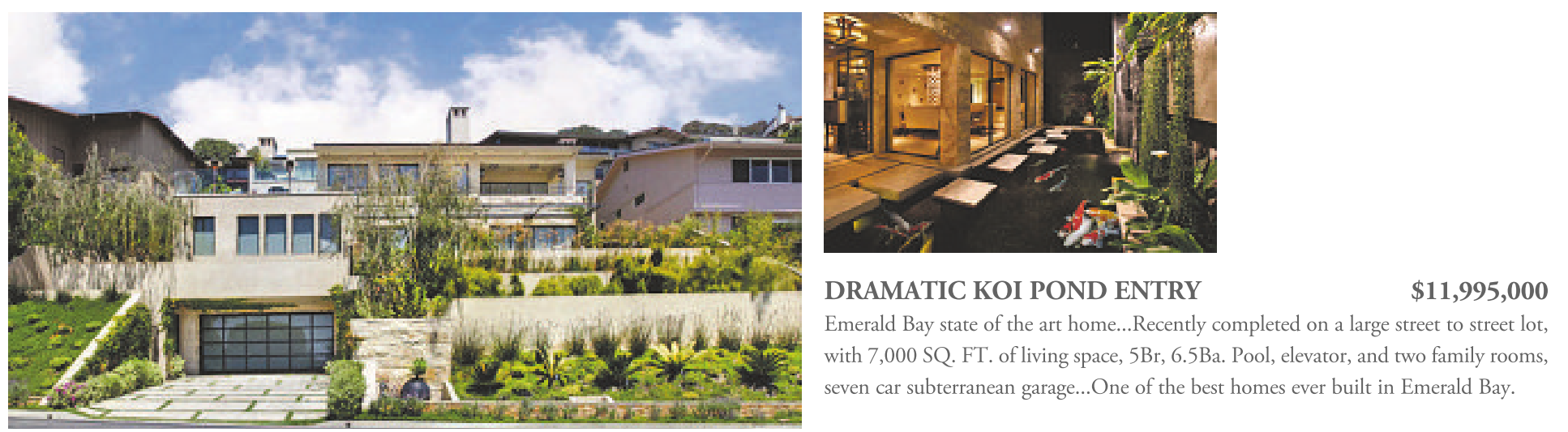 DRAMATIC KOI POND ENTRY $11,995,000 Emerald Bay state of the art home...Recently completed on a large street to street lot, with 7,000 SQ. FT. of living space, 5Br, 6.5Ba. Pool, elevator, and two family rooms, seven car subterranean garage...One of the best homes ever built in Emerald Bay.