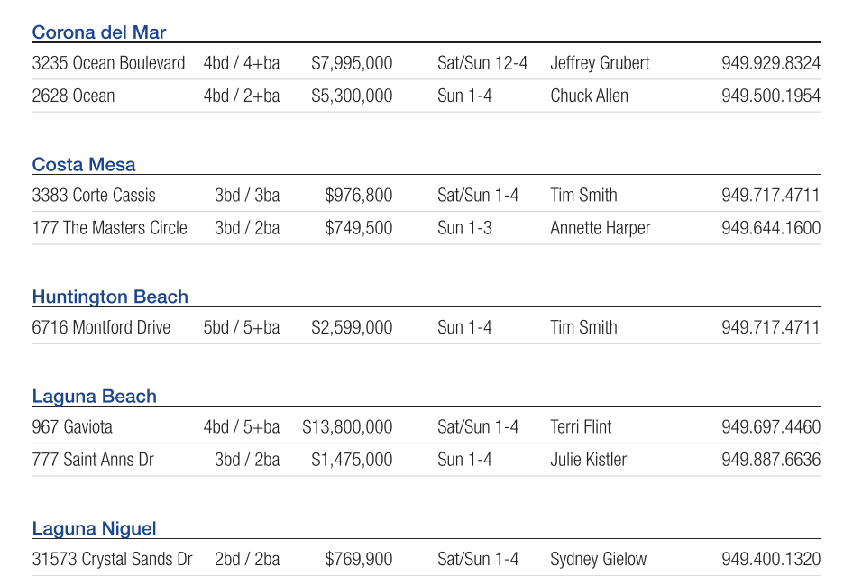 Corona del Mar 3235 Ocean Boulevard 4bd /4+ba $7,995,000 Sat/Sun 12-4 Jeffrey Grubert 949.929.8324 2628 Ocean 4bd /2+ba $5,300,000 Sun 1-4 Chuck Allen 949.500.1954