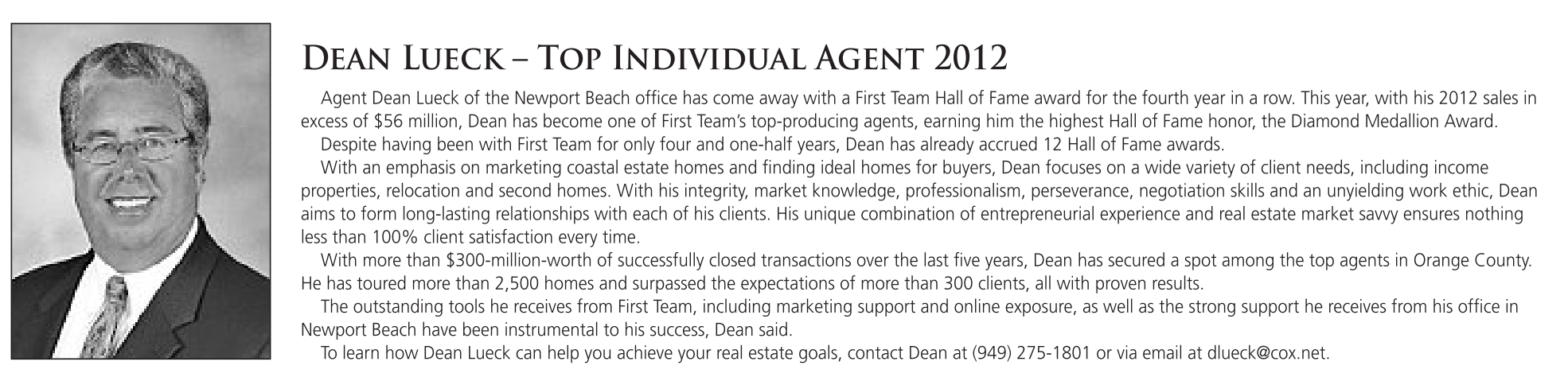 Agent Dean Lueck of the Newport Beach office has come away with a First Team Hall of Fame award for the fourth year in a row. This year, with his 2012 sales in excess of $56 million, Dean has become one of First Team’s top-producing agents, earning him the highest Hall of Fame honor, the Diamond Medallion Award.