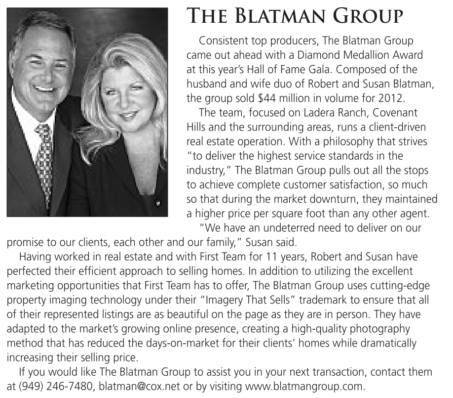 Consistent top producers, The Blatman Group came out ahead with a Diamond Medallion Award at this year’s Hall of Fame Gala. Composed of the husband and wife duo of Robert and Susan Blatman, the group sold $44 million in volume for 2012.