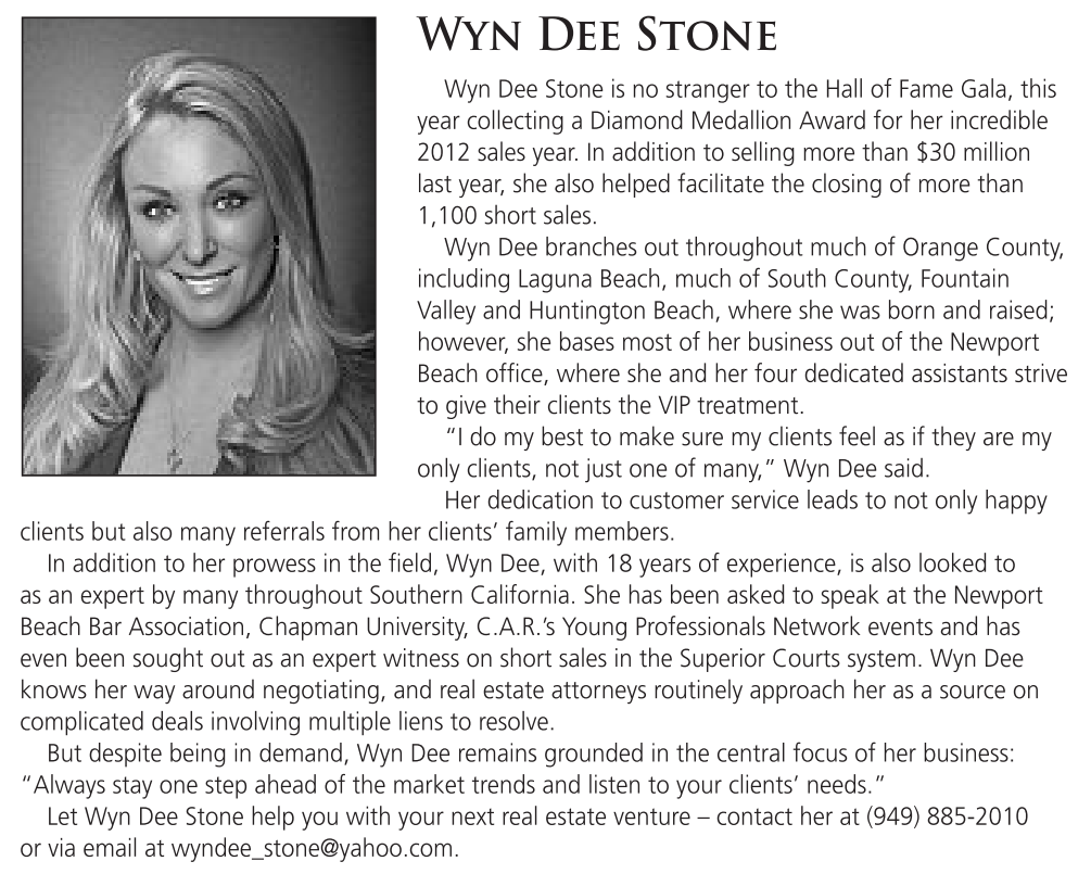 Wyn Dee Stone is no stranger to the Hall of Fame Gala, this year collecting a Diamond Medallion Award for her incredible 2012 sales year. In addition to selling more than $30 million last year, she also helped facilitate the closing of more than 1,100 short sales.