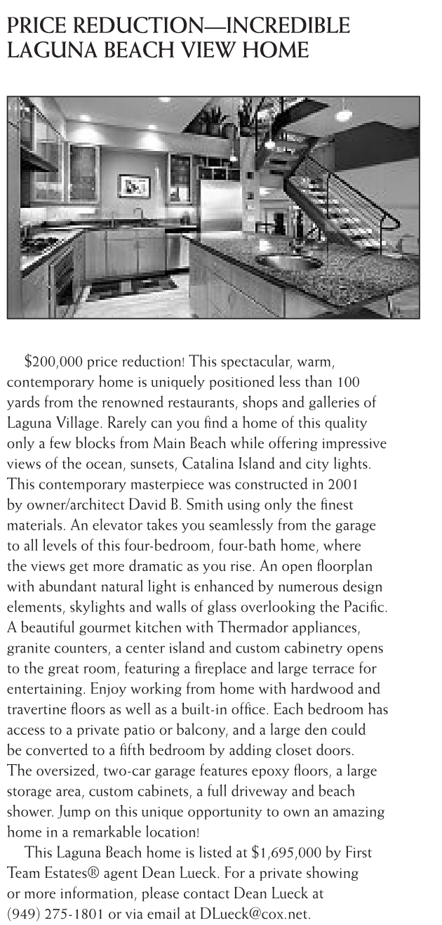 PRICE REDUCTION—INCREDIBLE LAGUNA BEACH VIEW HOME $200,000 price reduction! This spectacular, warm, contemporary home is uniquely positioned less than 100 yards from the renowned restaurants, shops and galleries of Laguna Village. Rarely can you find a home of this quality only afew blocks from Main Beach while offering impressive views of the ocean, sunsets, Catalina Island and city lights. This contemporary masterpiece was constructed in 2001 by owner/architect David B. Smith using only the finest materials. An elevator takes you seamlessly from the garage to all levels of this four-bedroom, four-bath home, where the views get more dramatic as you rise. An open floorplan with abundant natural light is enhanced by numerous design elements, skylights and walls of glass overlooking the Pacific. Abeautiful gourmet kitchen with Thermador appliances, granite counters, a center island and custom cabinetry opens to the great room, featuring a fireplace and large terrace for entertaining. Enjoy working from home with hardwood and travertine floors as well as a built-in office. Each bedroom has access to a private patio or balcony, and a large den could be converted to afifth bedroom by adding closet doors. The oversized, two-car garage features epoxy floors, a large storage area, custom cabinets, a full driveway and beach shower. Jump on this unique opportunity to own an amazing home in a remarkable location! This Laguna Beach home is listed at $1,695,000 by First Team Estates® agent Dean Lueck. For a private showing or more information, please contact Dean Lueck at (949) 275-1801 or via email at DLueck@cox.net.