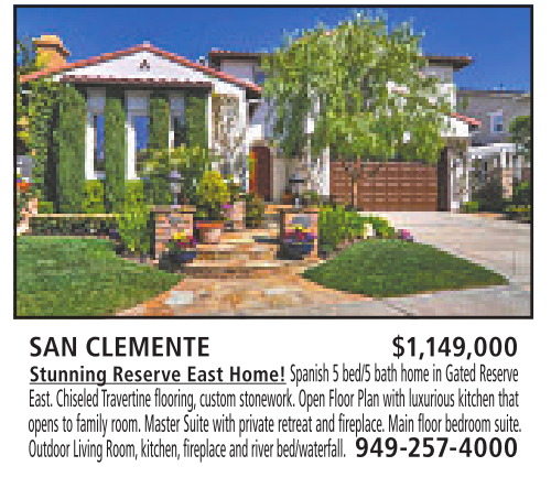 SAN CLEMENTE $1,149,000 Stunning Reserve East Home! Spanish 5bed/5 bath home in Gated Reserve East. Chiseled Travertine flooring, custom stonework. Open Floor Plan with luxurious kitchen that opens to family room. Master Suite with private retreat and fireplace.Main floor bedroom suite. Outdoor Living Room, kitchen, fireplace and river bed/waterfall. 949-257-4000