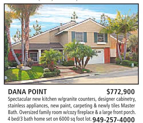 DANA POINT $772,900 Spectacular new kitchen w/granite counters, designer cabinetry, stainless appliances, new paint, carpeting &newly tiles Master Bath.Oversizedfamilyroomw/cozyfireplace&alarge frontporch. 4bed/3 bath homeset on 6000 sq foot lot.949-257-4000
