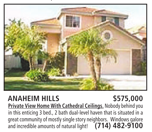 ANAHEIM HILLS $575,000 PrivateView HomeWithCathedralCeilings. Nobodybehindyou in this enticing 3bed., 2bath dual-level haven that issituated ina great community of mostly single storyneighbors. Windowsgalore andincredible amounts of natural light! (714) 482-9100