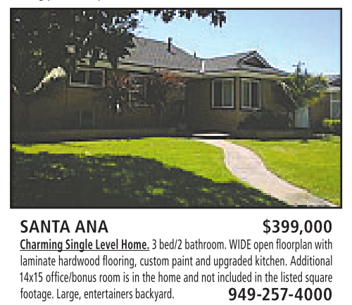 mingpooland spaand muchmore!Call 714-969-6100 SANTA ANA $399,000 Charming Single Level Home. 3bed/2 bathroom. WIDE openfloorplanwith laminate hardwood flooring, custom paint and upgraded kitchen. Additional 14x15 office/bonus room is in the home and not included in the listed square footage. Large,entertainersbackyard. 949-257-4000