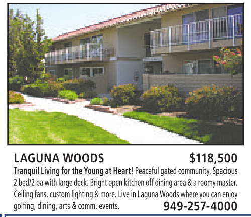 LAGUNA WOODS $118,500 Tranquil Living forthe YoungatHeart! Peacefulgated community, Spacious 2bed/2 ba with large deck. Bright openkitchen offdiningarea&aroomy master. Ceiling fans,customlighting&more.LiveinLagunaWoods where youcan enjoy golfing,dining, arts &comm. events. 949-257-4000