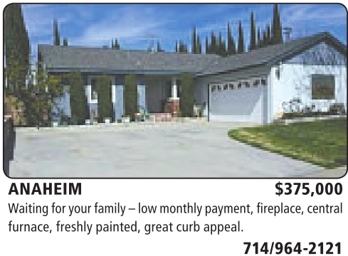 ANAHEIM $375,000 Waitingfor your family –low monthly payment, fireplace,central furnace, freshlypainted, great curb appeal.