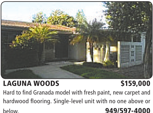 LAGUNA WOODS $159,000 Hardtofind Granada modelwithfresh paint,new carpet and hardwood flooring. Single-level unit with no one above or below. 949/597-4000