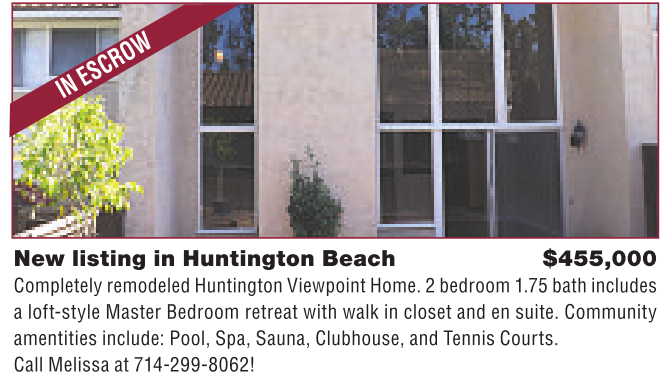 New listing in Huntington Beach $455,000 Completely remodeledHuntington Viewpoint Home.2bedroom 1.75 bath includes aloft-style Master Bedroom retreat with walk in closet and ensuite. Community amentities include: Pool, Spa, Sauna, Clubhouse, and TennisCourts. Call Melissaat714-299-8062!