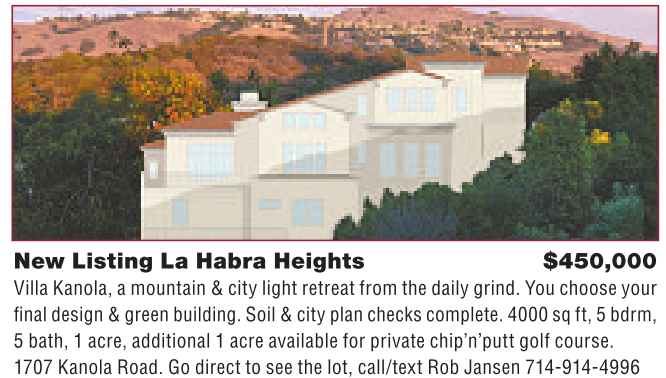 New Listing La Habra Heights $450,000 VillaKanola, amountain&citylight retreatfromthe daily grind. Youchooseyour final design&green building. Soil &cityplancheckscomplete. 4000 sq ft,5bdrm, 5bath, 1acre, additional 1acreavailablefor privatechip’n’puttgolf course. 1707 KanolaRoad. Go direct to see thelot, call/text Rob Jansen 714-914-4996