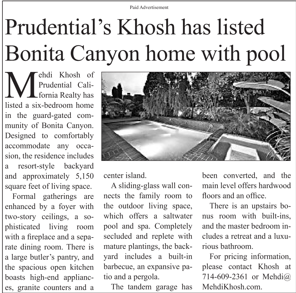 Prudential’s Khosh has listed Bonita Canyon home with pool