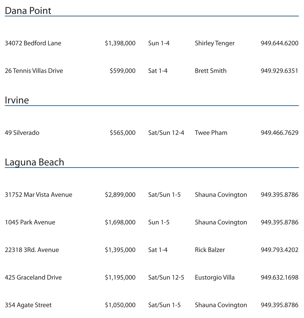 Dana Point 34072BedfordLane $1,398,000 Sun 1-4 Shirley Tenger 949.644.6200 26 Tennis Villas Drive $599,000 Sat 1-4 Brett Smith 949.929.6351 Irvine 49 Silverado $565,000 Sat/Sun 12-4 Twee Pham 949.466.7629 Laguna Beach 31752 MarVista Avenue $2,899,000 Sat/Sun 1-5 Shauna Covington 949.395.8786 1045 Park Avenue $1,698,000 Sun 1-5 Shauna Covington 949.395.8786 22318 3Rd.Avenue $1,395,000 Sat 1-4 Rick Balzer 949.793.4202 425 Graceland Drive $1,195,000 Sat/Sun 12-5 EustorgioVilla 949.632.1698 354 AgateStreet $1,050,000 Sat/Sun 1-5 Shauna Covington 949.395.8786