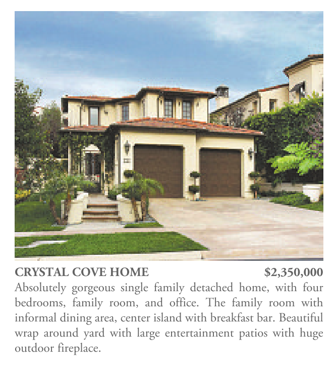CRYSTAL COVE HOME $2,350,000 Absolutely gorgeous single family detached home, with four bedrooms, family room, and office. The family room with informal dining area, center island with breakfast bar. Beautiful wrap around yard with large entertainment patios with huge outdoor fireplace.