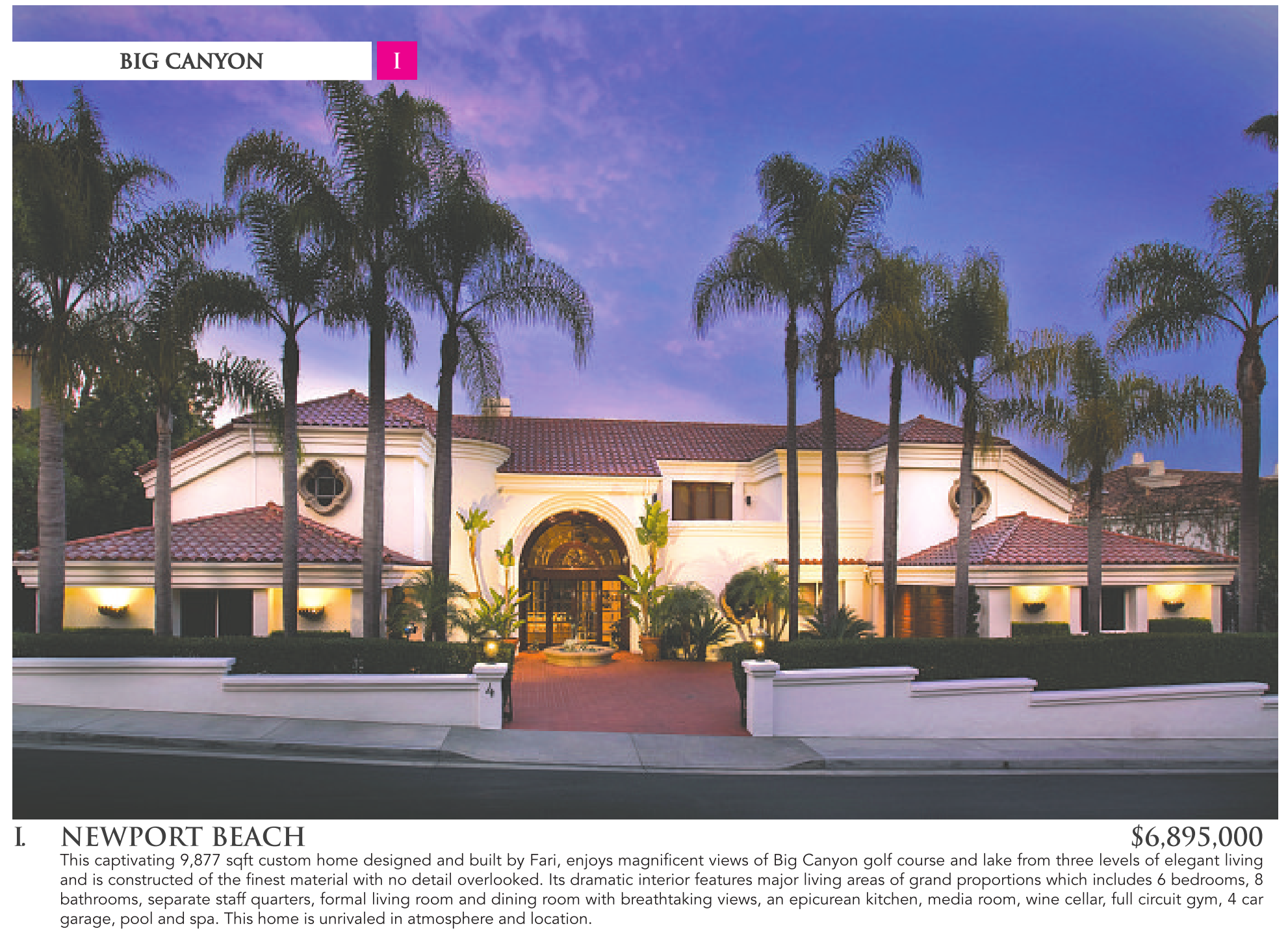 This captivating 9,877 sqft custom home designed and built by Fari, enjoys magnificent views of Big Canyon golf course and lake from three levels of elegant living