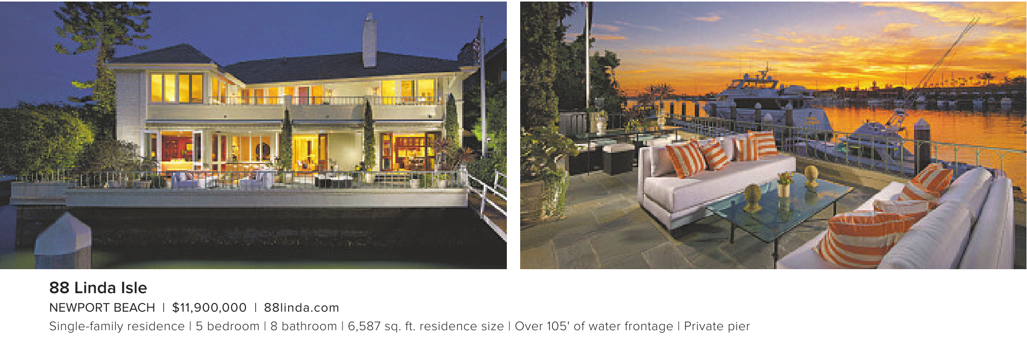 NEWPORT BEACH | $11,900,000 | 88linda.com Single-family residence | 5 bedroom | 8 bathroom | 6,587 sq. ft. residence size | Over 105' of water frontage | Private pier