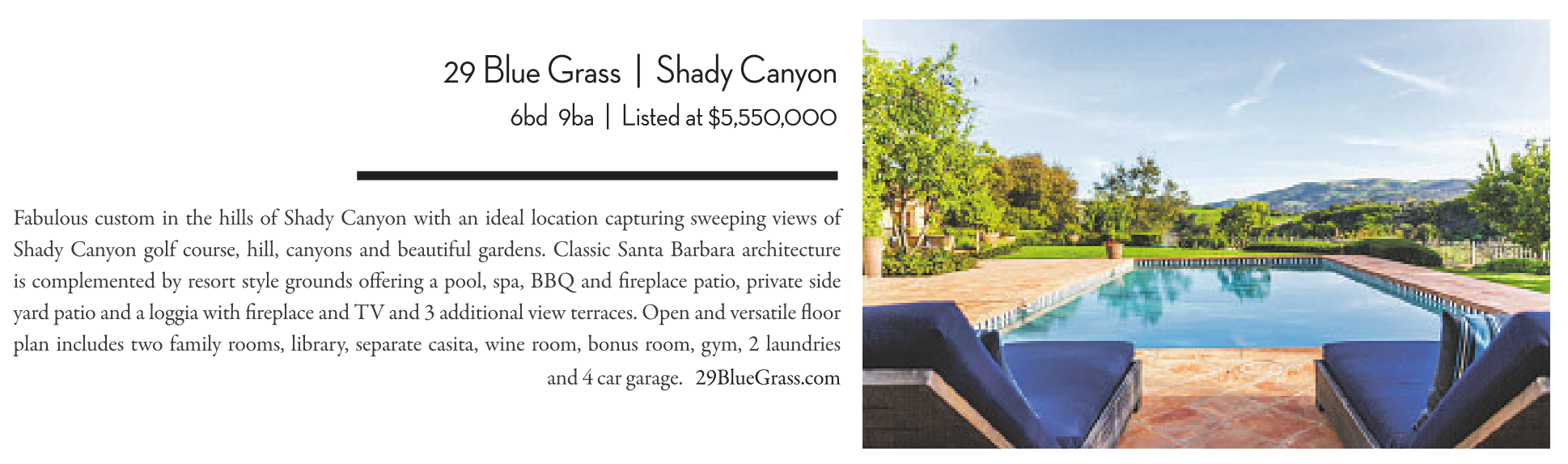 29 Blue Grass | Shady Canyon 6bd 9ba | Listed at $5,550,000 Fabulous custom in the hills of Shady Canyon with an ideal location capturing sweeping views of Shady Canyon golf course, hill, canyons and beautiful gardens. Classic Santa Barbara architecture is complemented by resort style grounds offering a pool, spa, BBQ and fireplace patio, private side yardpatio and aloggiawithfireplace and TV and 3additional view terraces.Openand versatile floor plan includes two family rooms, library, separate casita, wine room, bonus room, gym, 2 laundries and 4car garage. 29BlueGrass.com