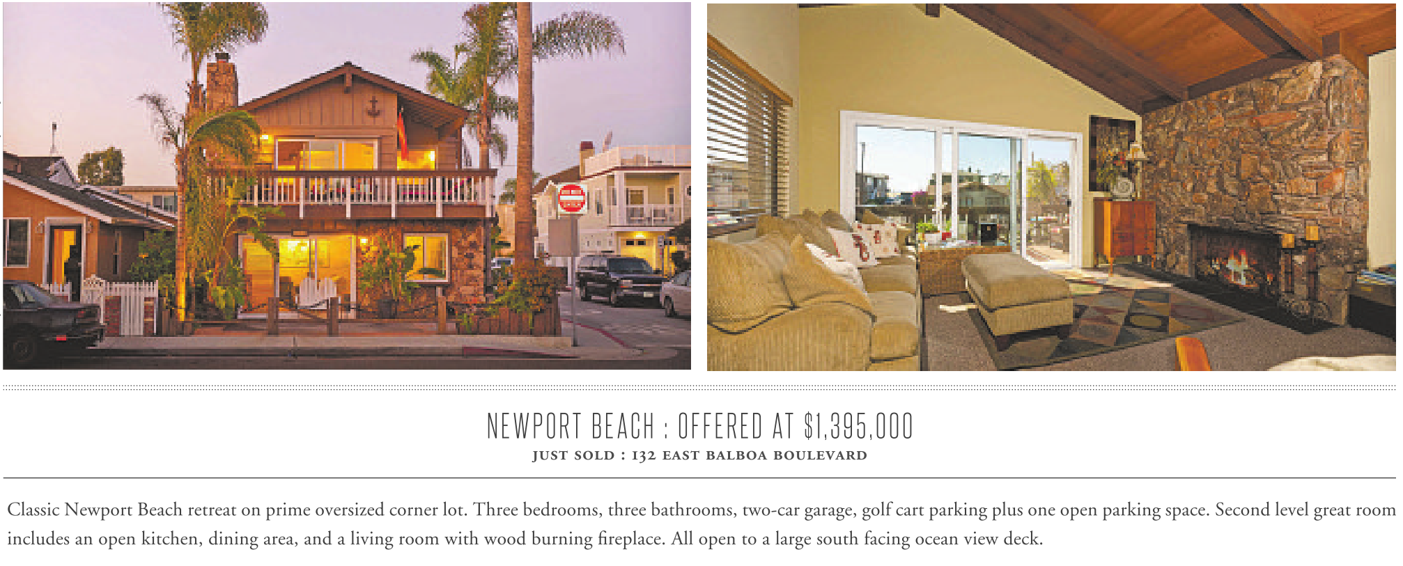 48 NEWPORT BEACH : OFFERED AT $1,395,000 just sold : 132 east balboa boulevard Classic Newport Beach retreat on prime oversized corner lot. Three bedrooms, three bathrooms, two-car garage, golf cart parking plus one open parking space. Second level great room includes an open kitchen, dining area, and a living room with wood burning fireplace. All open to a large south facing ocean view deck.