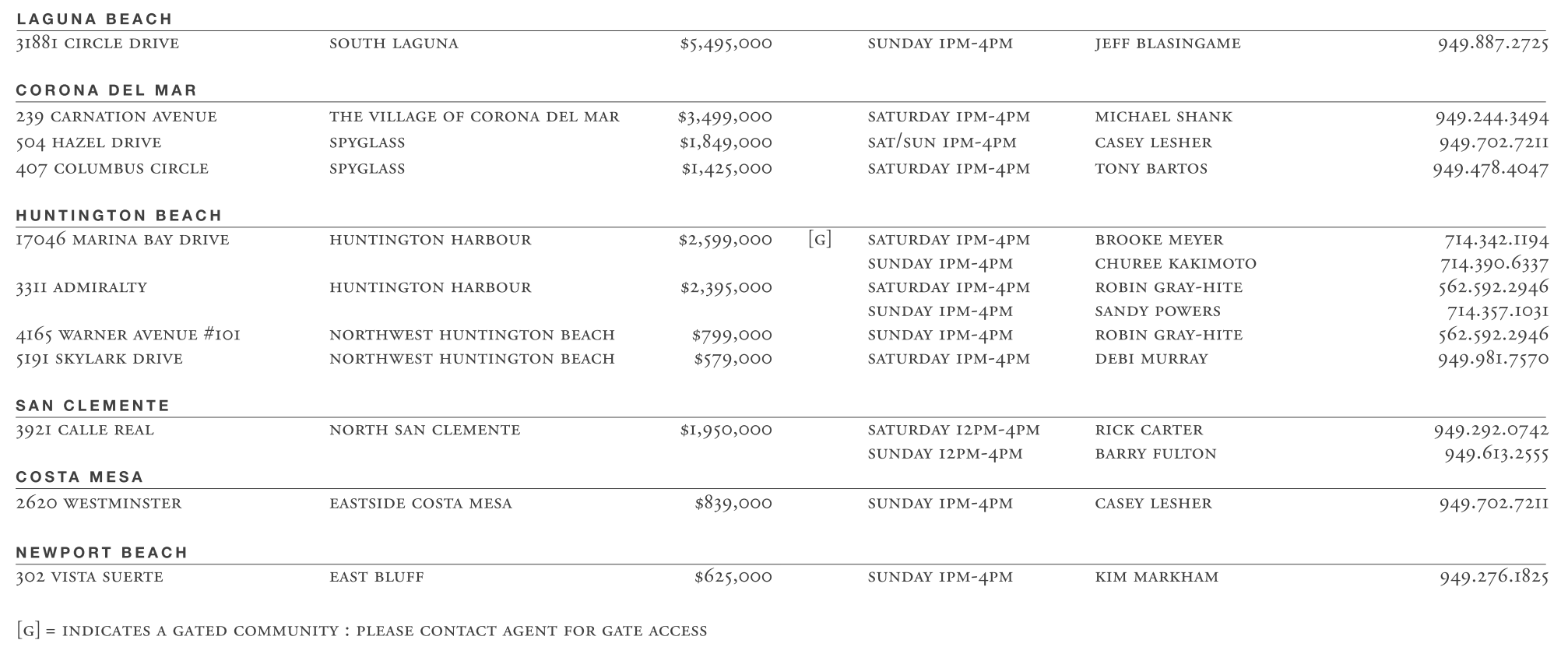 239 carnation avenue the village of corona del mar $3,499,000 saturday 1pm-4pm michael shank 949.244.3494 504 hazel drive spyglass $1,849,000 sat/sun 1pm-4pm casey lesher 949.702.7211 407 columbus circle spyglass $1,425,000 saturday 1pm-4pm tony bartos 949.478.4047