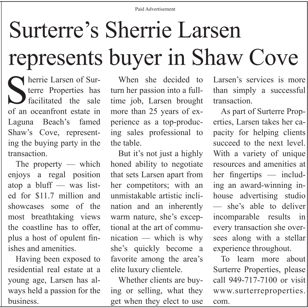 Larsen of Surterre Properties has facilitated the sale of an oceanfront estate in Laguna Beach’s famed Shaw’s Cove, representing the buying party in the transaction.