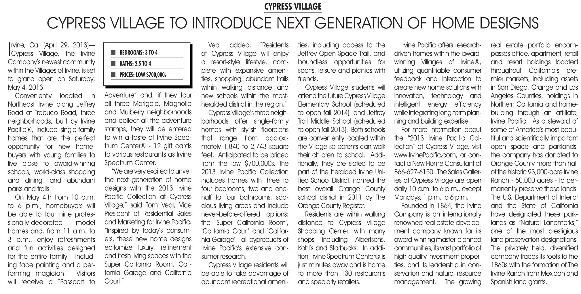 Ca. (April 29, 2013)— Cypress Village, the Irvine Company’s newest community within the Villages of Irvine,isset to grand open on Saturday, May 4, 2013.