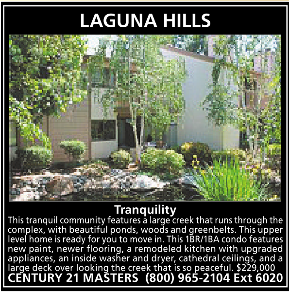 LAGUNA HILLS Tranquility This tranquil communityfeaturesalarge creek thatrunsthrough the complex,withbeautiful ponds, woodsand greenbelts. This upper levelhomeisready foryou to move in.This1BR/1BA condo features new paint, newer flooring, a remodeled kitchen with upgraded appliances, aninside washer and dryer, cathedral ceilings, and alarge deck over looking the creek that issopeaceful. $229,000 CENTURY 21 MASTERS (800) 965-2104 Ext 6020