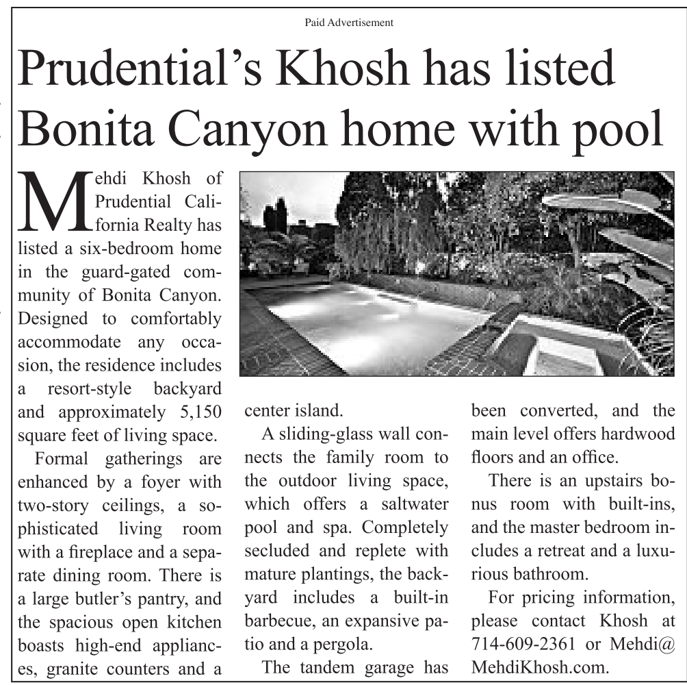 Prudential’s Khosh has listed Bonita Canyon home with pool