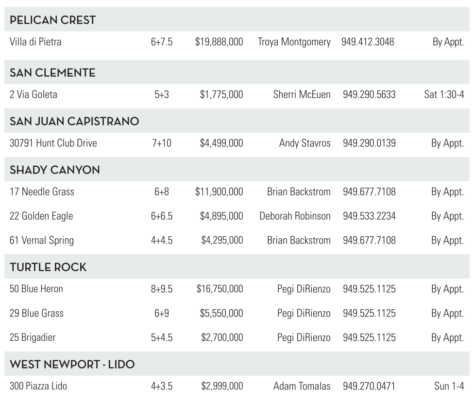 300 Piazza Lido 4+3.5 $2,999,000 Adam Tomalas 949.270.0471 Sun 1-4