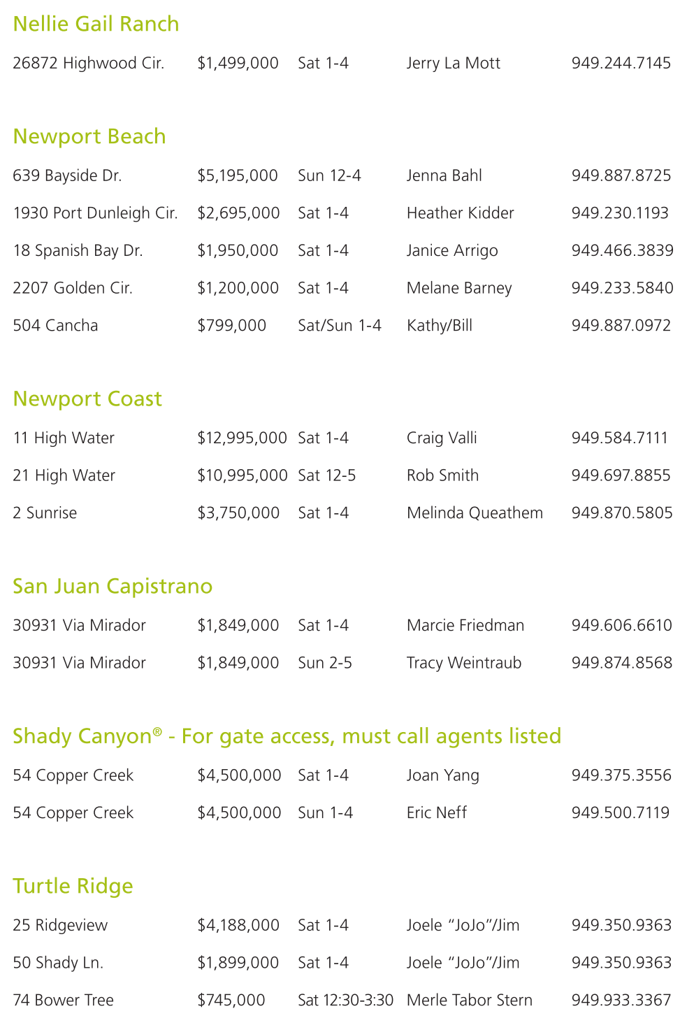 639 Bayside Dr. $5,195,000 Sun 12-4 Jenna Bahl 949.887.8725 1930 Port Dunleigh Cir. $2,695,000 Sat 1-4 Heather Kidder 949.230.1193 18 Spanish Bay Dr. $1,950,000 Sat 1-4 Janice Arrigo 949.466.3839 2207 Golden Cir. $1,200,000 Sat 1-4 Melane Barney 949.233.5840 504 Cancha $799,000 Sat/Sun 1-4 Kathy/Bill 949.887.0972