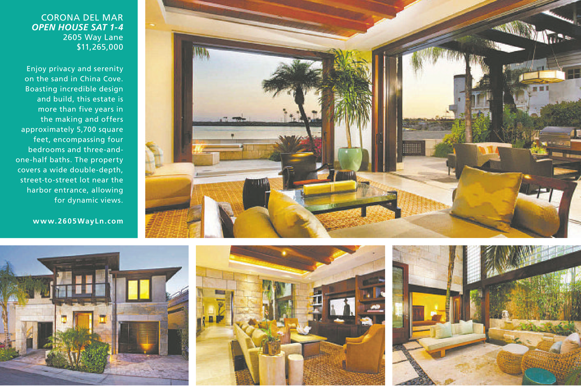 CORONA DEL MAR OPEN HOUSE SAT 1-4 2605 Way Lane $11,265,000 Enjoy privacy and serenity on the sand in China Cove. Boasting incredible design and build, this estate is more than five years in the making and offers approximately 5,700 square feet, encompassing four bedrooms and three-andone-half baths. The property covers a wide double-depth, street-to-street lot near the harbor entrance, allowing for dynamic views. www.2605WayLn.com See also