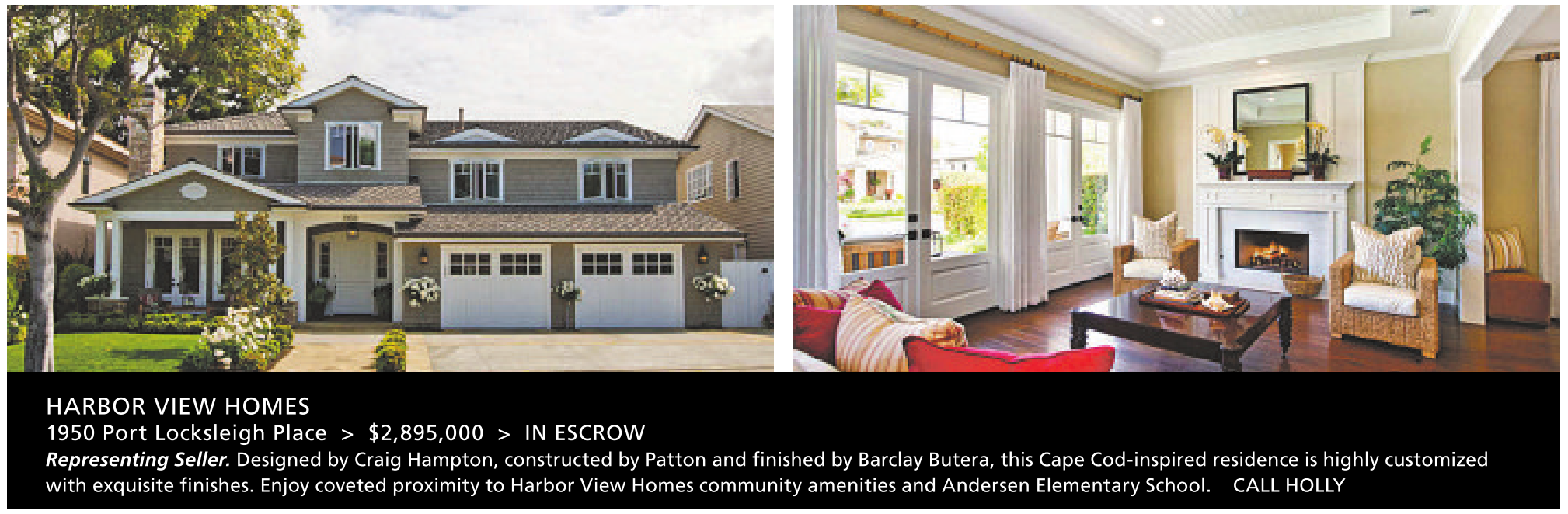 HARBOR VIEW HOMES 1950 Port Locksleigh Place > $2,895,000 > IN ESCROW Representing Seller. Designed by Craig Hampton, constructed by Patton and finished by Barclay Butera, this Cape Cod-inspired residence is highly customized with exquisite finishes. Enjoy coveted proximity to Harbor View Homes community amenities and Andersen Elementary School. CALL HOLLY