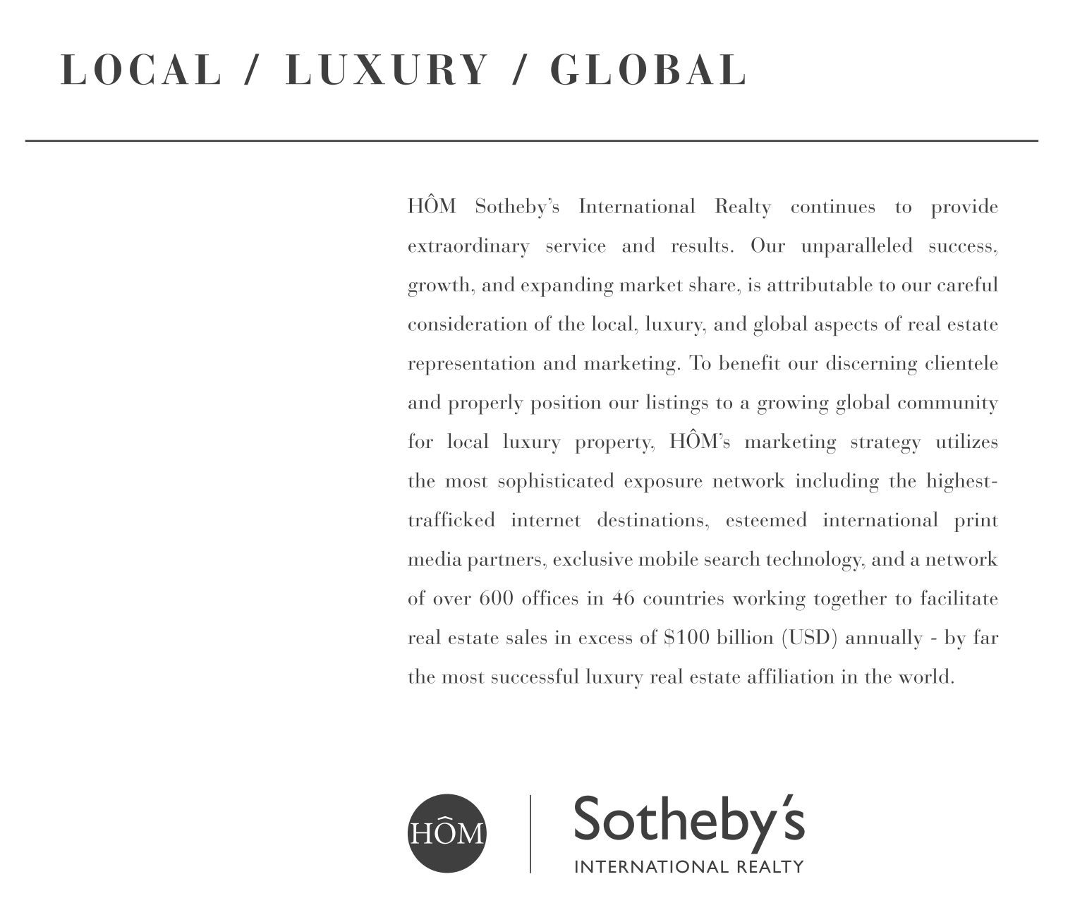 HÔM Sotheby’s International Realty continues to provide extraordinary service and results. Our unparalleled success, growth, and expanding market share, is attributable to our careful consideration of the local, luxury, and global aspects of real estate representation and marketing. To benefit our discerning clientele and properly position our listings to a growing global community for local luxury property, HÔM’s marketing strategy utilizes the most sophisticated exposure network including the highesttrafficked internet destinations, esteemed international print media partners, exclusive mobile search technology, and a network of over 600 offices in 46 countries working together to facilitate real estate sales in excess of $100 billion (USD) annually - by far the most successful luxury real estate affiliation in the world.