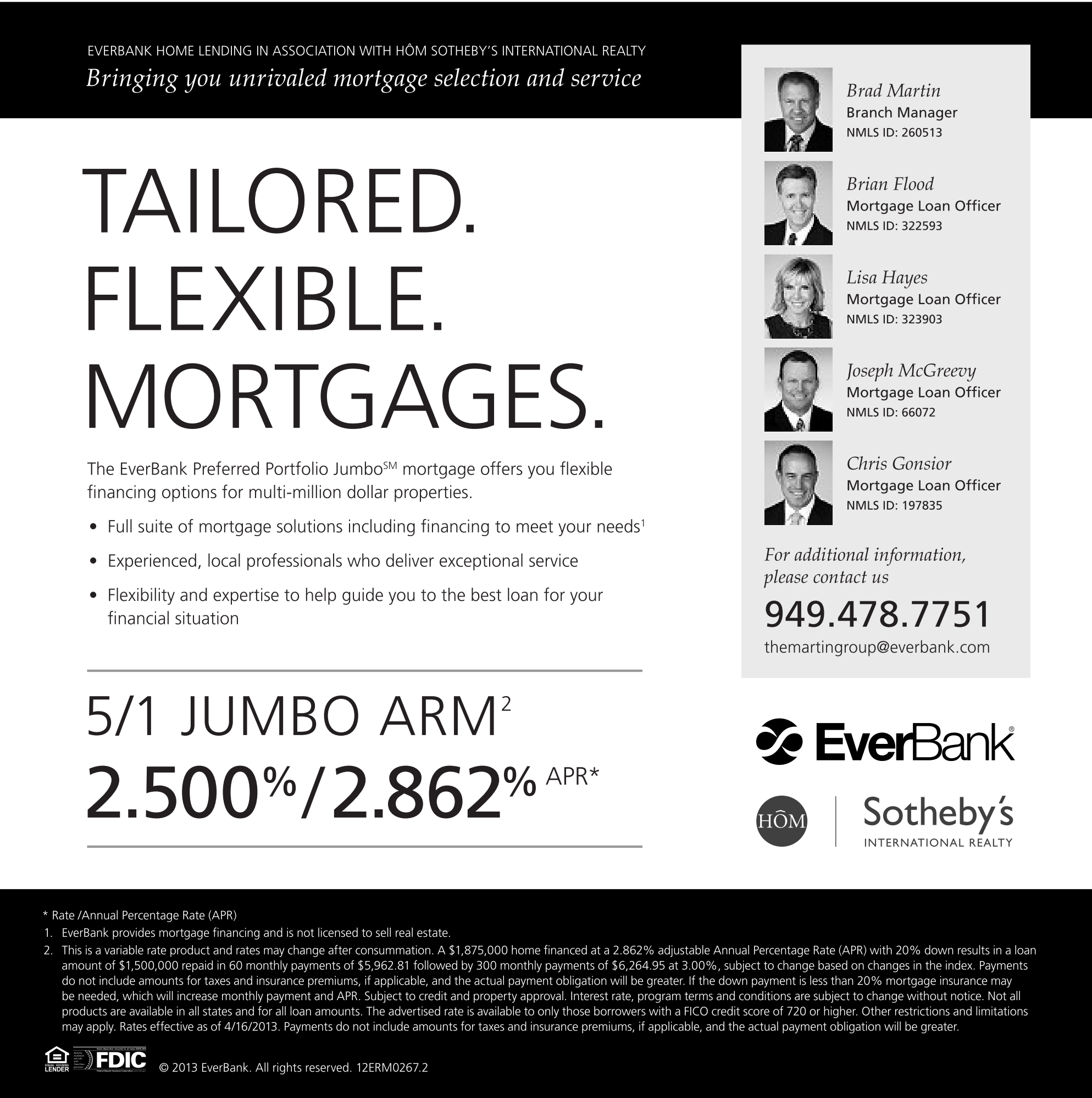 * Rate /Annual Percentage Rate (APR) 1. EverBank provides mortgage financing and is not licensed to sell real estate. 2. this is avariablerateproduct andrates maychangeafter consummation.A$1,875,000 homefinanced at a2.862%adjustableAnnualPercentageRate(APR) with 20%downresults in aloan amount of $1,500,000 repaid in 60 monthlypaymentsof$5,962.81 followedby300 monthlypaymentsof$6,264.95 at 3.00%, subjecttochangebased on changes in theindex.Payments do notinclude amountsfor taxesand insurance premiums,ifapplicable, andthe actual paymentobligation will be greater. if thedownpayment is lessthan20% mortgage insurance may be needed,which will increase monthlypayment andAPR.subjecttocredit and property approval.interestrate, programterms andconditionsare subjecttochangewithoutnotice. notall products areavailableinall statesand forall loan amounts. theadvertisedrateisavailabletoonlythose borrowers with aFicocredit scoreof720 or higher.other restrictions andlimitations mayapply.Rates effectiveasof4/16/2013.Paymentsdonot includeamounts fortaxes andinsurance premiums,ifapplicable, andthe actual paymentobligation will be greater.