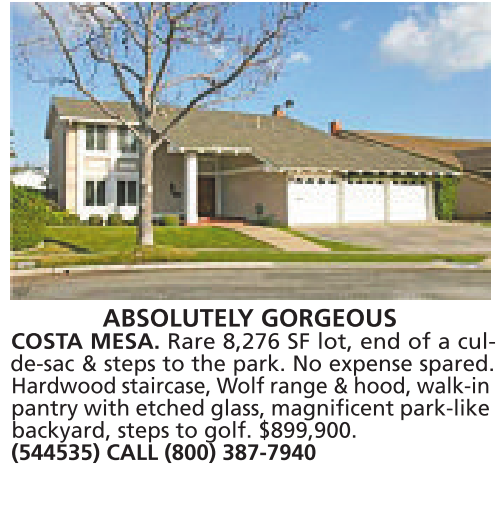 ABSOLUTELY GORGEOUS COSTA MESA. Rare 8,276 SF lot, end of a culde-sac & steps to the park. No expense spared. Hardwood staircase, Wolf range &hood, walk-in pantry with etched glass, magnificent park-like backyard, steps to golf. $899,900. (544535) CALL (800) 387-7940