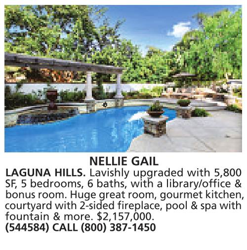 NELLIE GAIL LAGUNA HILLS. Lavishly upgraded with 5,800 SF, 5 bedrooms, 6 baths, with a library/office & bonus room. Huge great room, gourmet kitchen, courtyard with 2-sided fireplace, pool &spa with fountain & more. $2,157,000. (544584) CALL (800) 387-1450