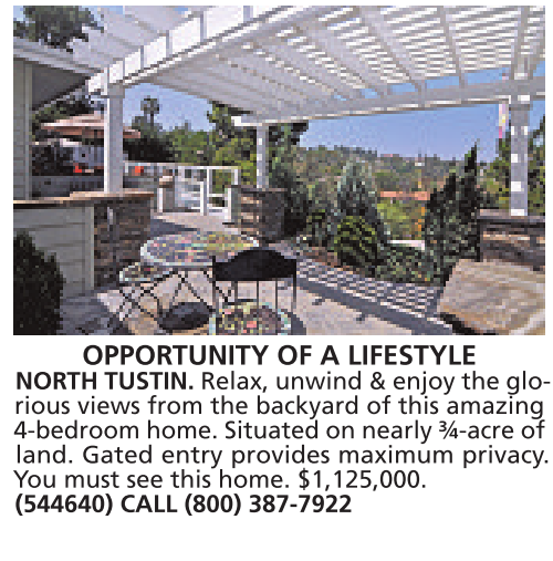 OPPORTUNITY OF A LIFESTYLE NORTH TUSTIN. Relax, unwind & enjoy the glorious views from the backyard of this amazing 4-bedroom home. Situated on nearly ¾-acre of land. Gated entry provides maximum privacy. You must see this home. $1,125,000. (544640) CALL (800) 387-7922