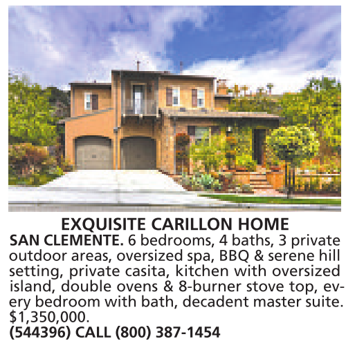 EXQUISITE CARILLON HOME SANCLEMENTE. 6bedrooms, 4baths, 3private outdoorareas, oversized spa, BBQ &serene hill setting, private casita, kitchen with oversized island, double ovens & 8-burner stove top, every bedroom with bath, decadent master suite. $1,350,000. (544396) CALL (800) 387-1454