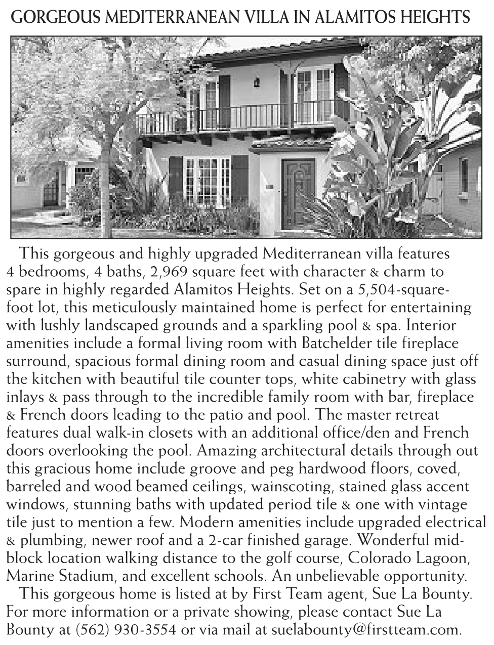 For more information or a private showing, please contact Sue La Bounty at (562) 930-3554 or via mail at suelabounty@firstteam.com.