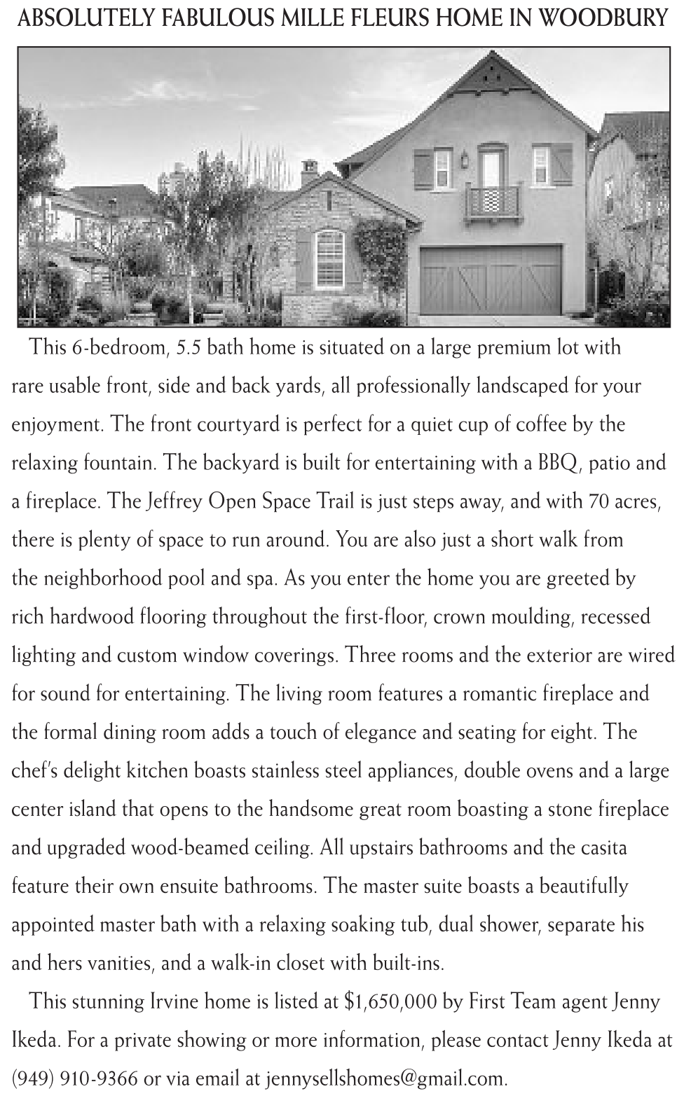 ABSOLUTELY FABULOUS MILLE FLEURS HOME IN WOODBURY This 6-bedroom, 5.5 bath home is situated on a large premium lot with rare usable front, side and back yards, all professionally landscaped for your enjoyment. The front courtyard is perfect for a quiet cup of coffee by the relaxing fountain. The backyard is built for entertaining with a BBQ, patio and a fireplace. The Jeffrey Open Space Trail is just steps away, and with 70 acres, there is plenty of space to run around. You are also just a short walk from the neighborhood pool and spa. As you enter the home you are greeted by rich hardwood flooring throughout the first-floor, crown moulding, recessed lighting and custom window coverings. Three rooms and the exterior are wired for sound for entertaining. The living room features a romantic fireplace and the formal dining room adds a touch of elegance and seating for eight. The chef’s delight kitchen boasts stainless steel appliances, double ovens and a large center island that opens to the handsome great room boasting a stone fireplace and upgraded wood-beamed ceiling. All upstairs bathrooms and the casita feature their own ensuite bathrooms. The master suite boasts a beautifully appointed master bath with a relaxing soaking tub, dual shower, separate his and hers vanities, and a walk-in closet with built-ins. This stunning Irvine home is listed at $1,650,000 by First Team agent Jenny Ikeda. For a private showing or more information, please contact Jenny Ikeda at (949) 910-9366 or via email at jennysellshomes@gmail.com.