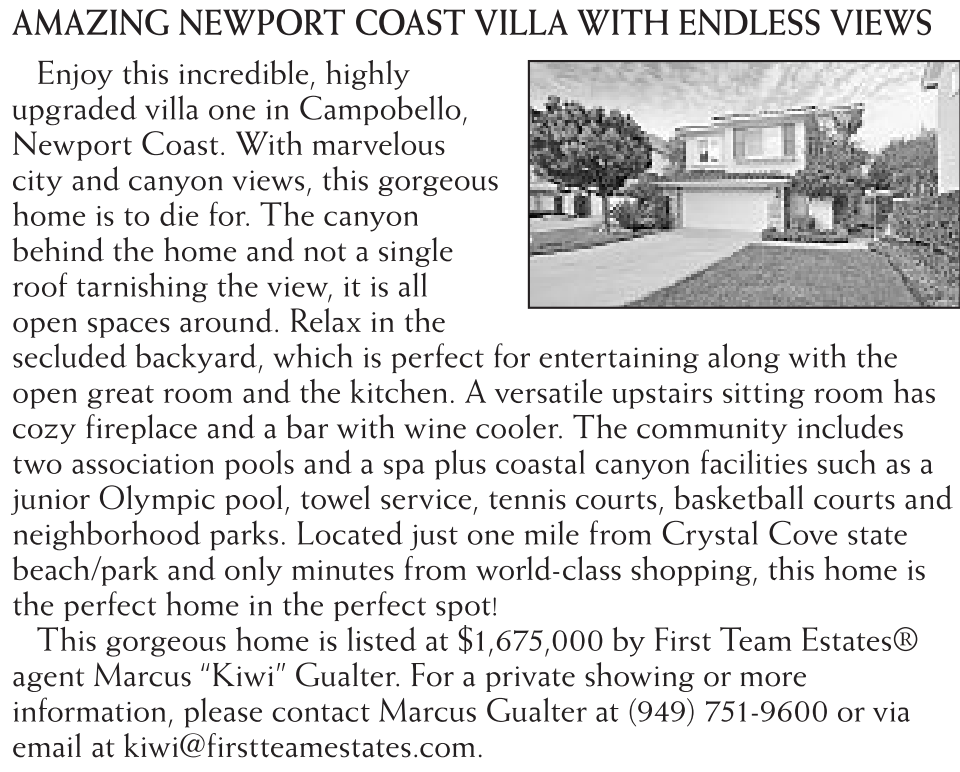 This gorgeous home is listed at $1,675,000 by First Team Estates® agent Marcus “Kiwi” Gualter. For a private showing or more information, please contact Marcus Gualter at (949) 751-9600 or via email at kiwi@firstteamestates.com.