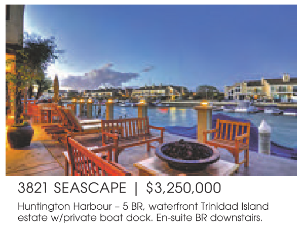 Huntington Harbour – 5 BR, waterfront Trinidad Island estate w/private boat dock. En-suite BR downstairs.
