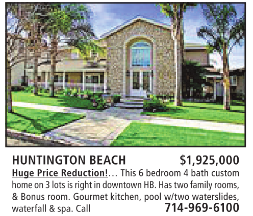homeon3lotsisright in downtown HB.Has twofamilyrooms, &Bonus room. Gourmet kitchen, pool w/two waterslides, waterfall&spa. Call 714-969-6100