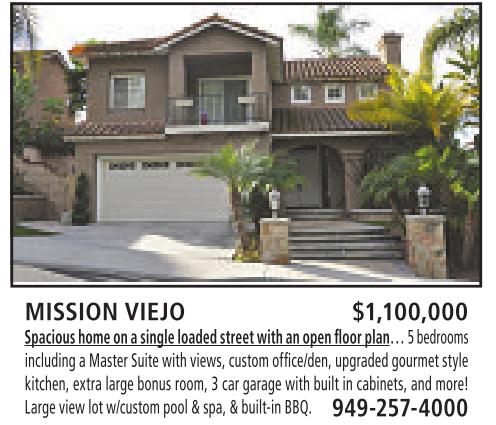 MISSION VIEJO $1,100,000 Spacious home on asingle loadedstreetwithanopenfloor plan… 5bedrooms including aMaster Suite with views, customoffice/den,upgraded gourmet style kitchen, extra large bonus room, 3car garage with built in cabinets, and more! Large view lotw/custompool&spa,&built-inBBQ. 949-257-4000